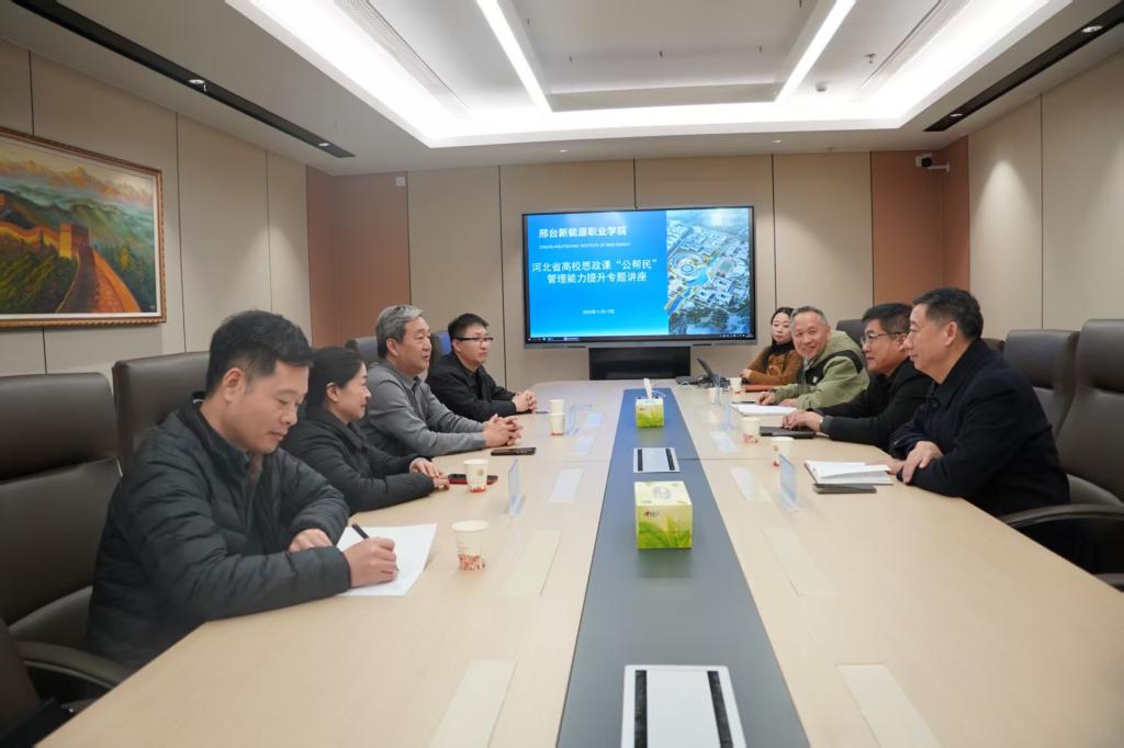 在研讨环节,双方围绕马克思主义学院建设、思政课教学改革创新等议题展开深入交流。王宏斌院长作了以管理能力提升为主题的专题讲座,结合石家庄铁道大学马克思主义学院建设经验,分享了思政课改革创新的实践路径,并就名师工作室建设、智慧课程开发、教师科研能力提升等方面提出合作建议。邢台新能源职业学院领导及教务部门负责人就课程建设、青年教师培养等话题与专家团队进行了深入交流。