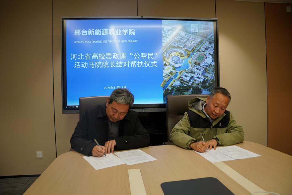 在随后举行的河北省高校思政课“公帮民”活动马院院长结对帮扶仪式上,石家庄铁道大学马克思主义学院院长王宏斌与邢台新能源职业学院马克思主义学院院长杨建法共同签署结对帮扶协议,标志着两校思政课建设合作机制正式建立。